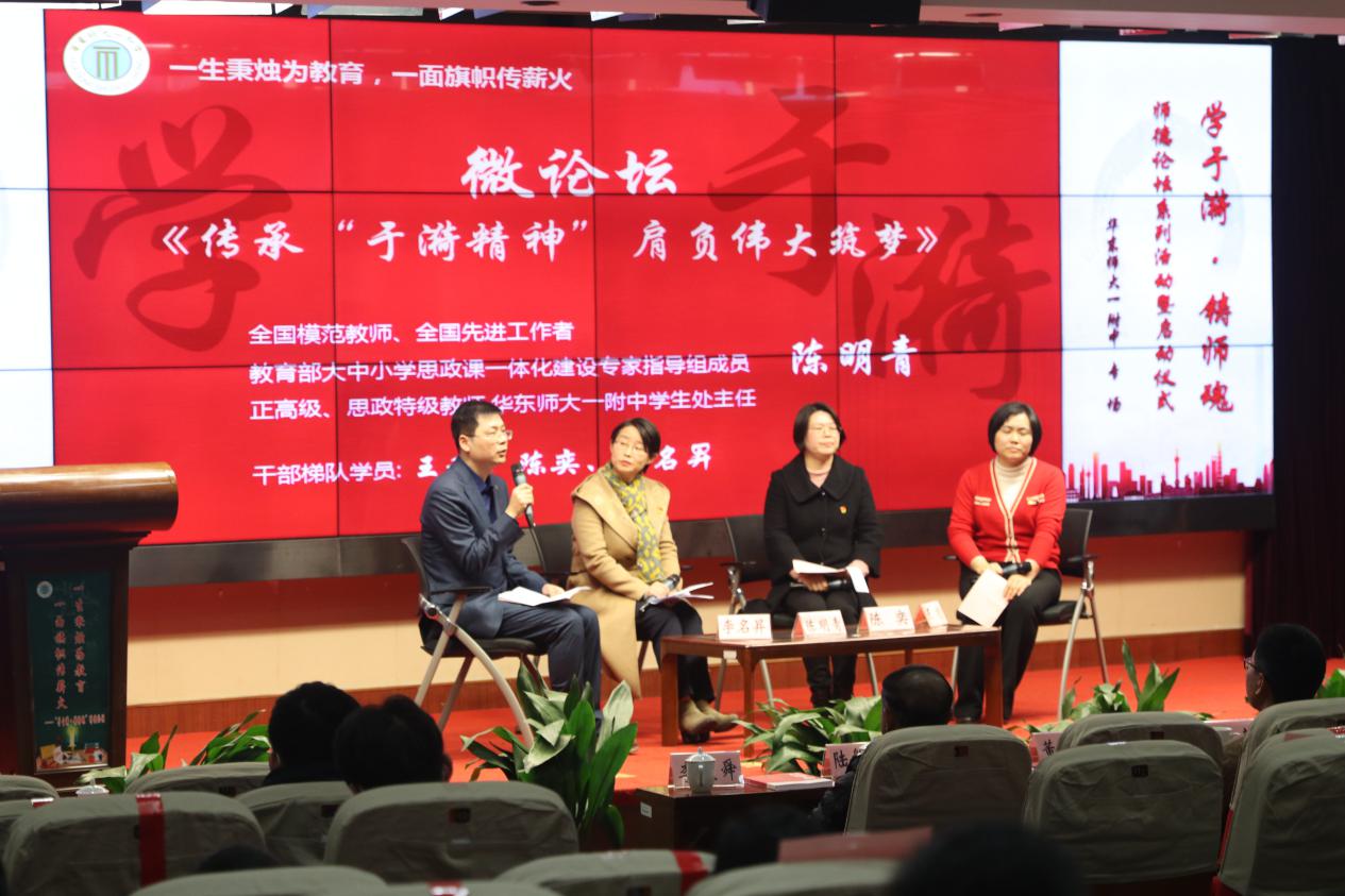 为致敬人民教育家于漪老师、传承于漪老师的教育精神,彰显上海基础教育的先进理念。2021年1月15日下午,由华东师大一附中发起,华东师范大学第一附属中学、华东师范大学第一附属初级中学、北虹高级中学、曲阳第二中学、民办新华初级中学、华师大一附中实验小学等六所学校联合主办的“学于漪·铸师魂”师德论坛暨启动仪式在华东师范大学第一附属中学举行。