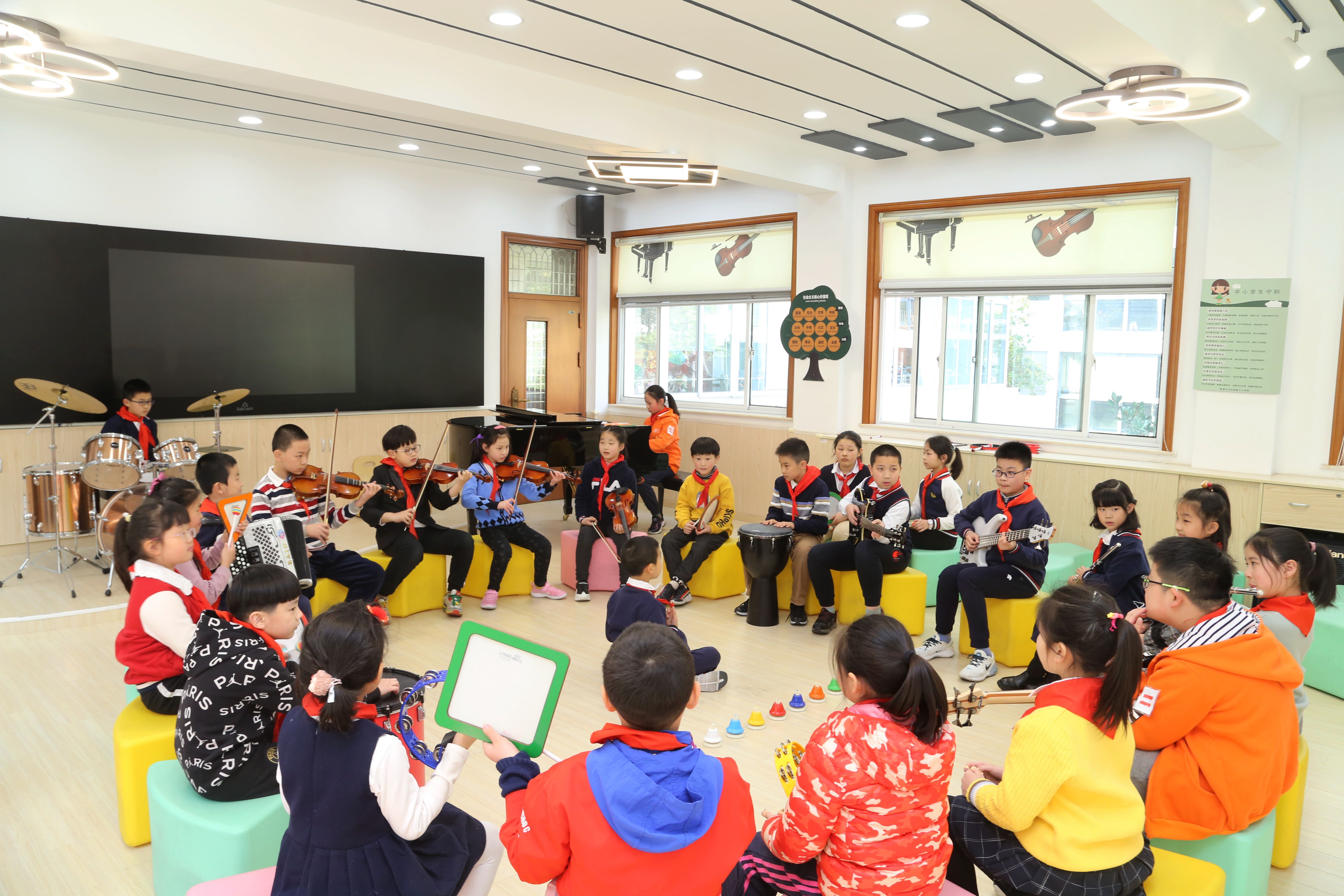 在音乐社团课上,孩子们合奏一曲《爱的礼赞》