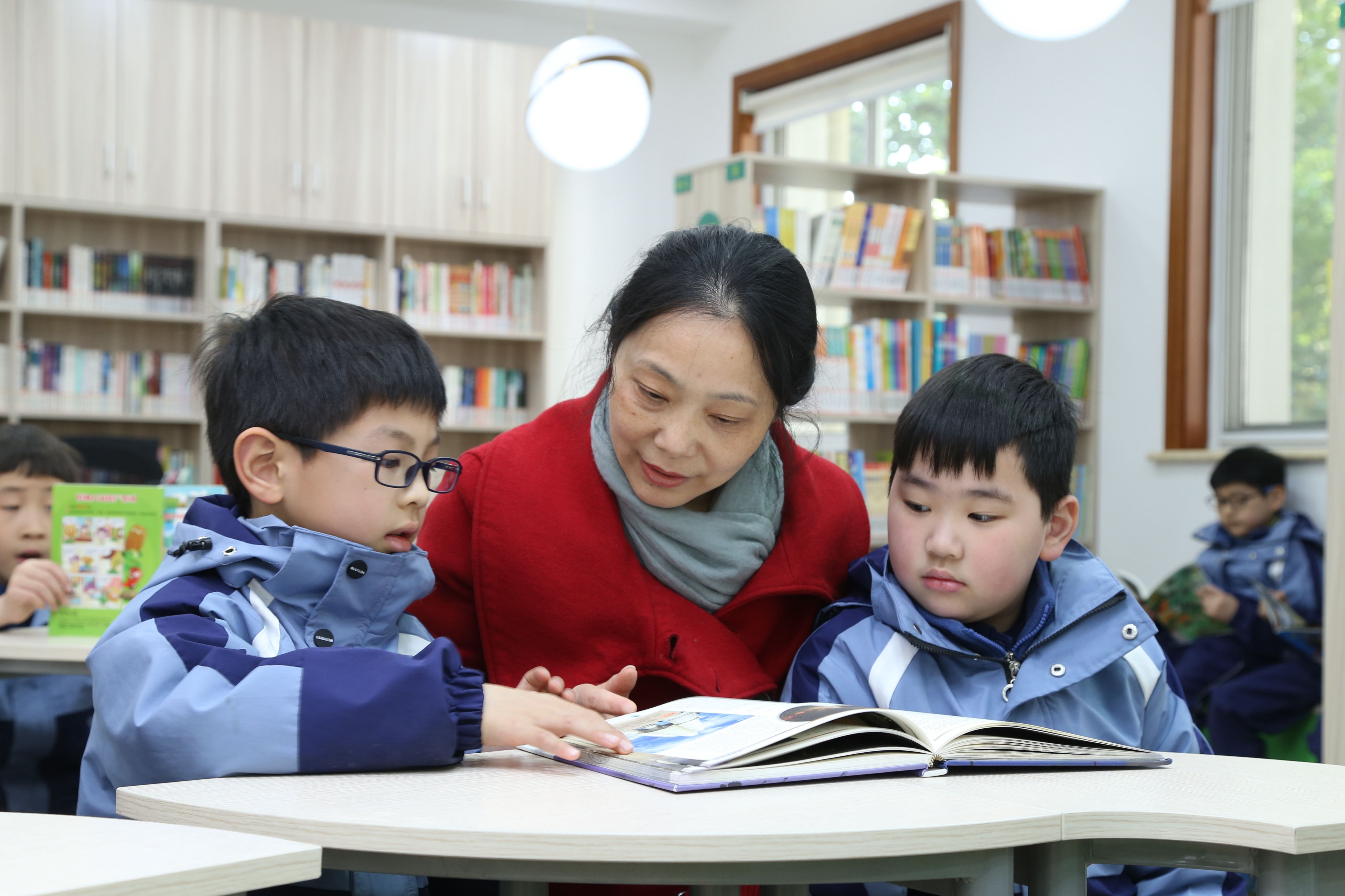 在学校阅览室里,志愿者老师带着学生一起阅读