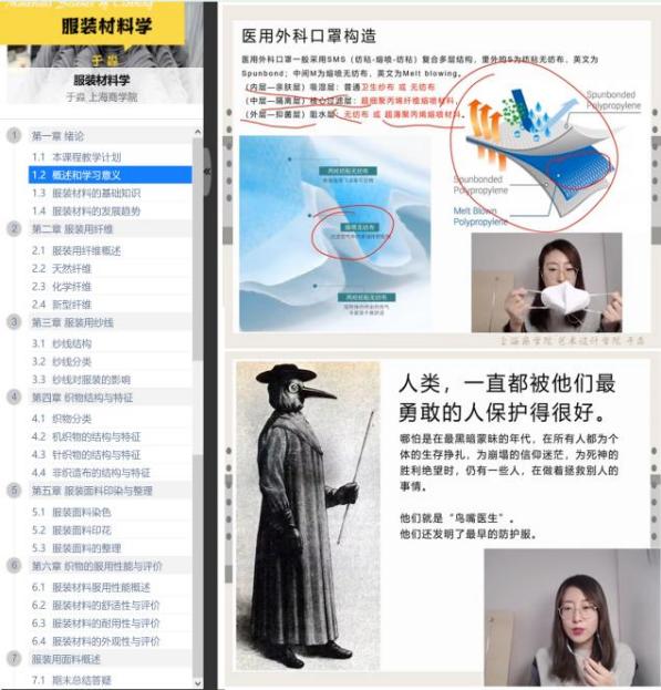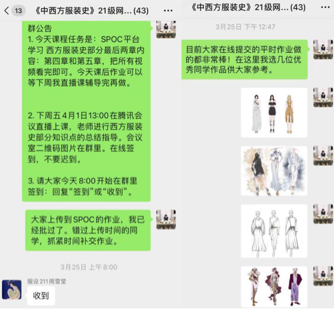 服装与服饰设计专业教师于淼通过多样化教学手段、提升线上教学质量,融合社会热点、将课程思政融入专业教学。在《中西方服装史》课程教学中,她采用“SPOC平台自学+腾讯会议直播辅导+微信群管理”,充分运用课程SPOC平台自由讨论区。在她的课上,学生们可以自由上传作品与老师、同学交流,提升了网络课堂的活跃度。在《服装市场营销》和《服装材料学》两门课上,她采用“超星学习通平台+教师录课+腾讯会议直播辅导+微信群”的授课方式,为学生讲解中国服装业今后发展的方向,鼓励学生珍惜在大学里的学习机会,练就真本领,为祖国的未来发展做出贡献。