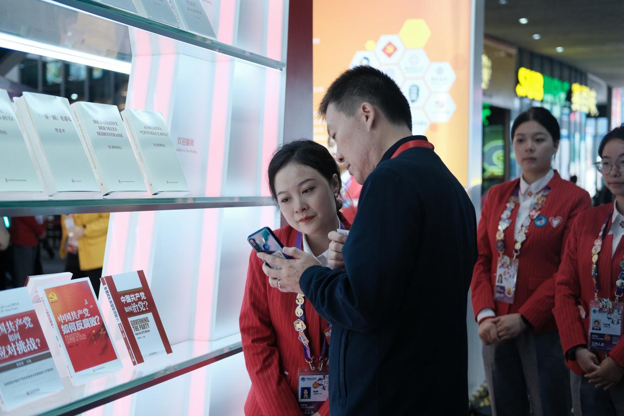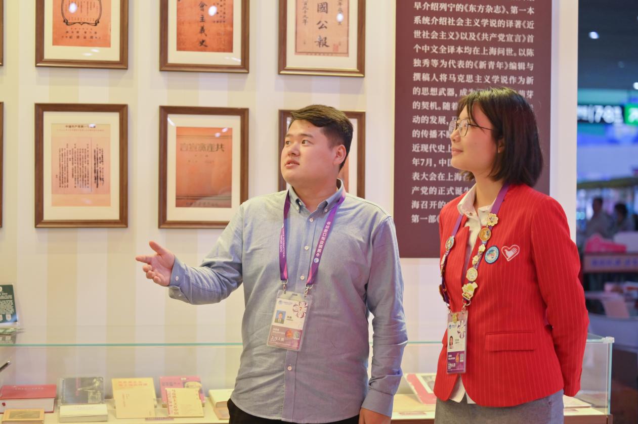 海大“小叶子”程静和方芷冉是党群服务站习近平总书记著作区域的志愿者,这个区域向广大宾客展呈了《习近平谈治国理政》及习近平总书记关于共建“一带一路”重要论述多语种版本书籍,吸引着进博会的党组织、党员和展客商前来学习。作为一名马克思主义理论专业的研究生,程静坦言“我从第一天正式上岗就一直与不同国家的外国友人接触、交流、合影留念,‘讲好中国故事,传播好中国声音’,从以前在教材上出现的话语,到进博会的真正落地,是党群服务站给了我这个机会”。方芷冉来自上海海洋大学外国语学院,她自豪地说:“在岗位上,我发挥自身外语优势,用中、英、日、法四国语言为游客宣传新思想,向外国友人赠送《习近平谈治国理政》等书籍。目前,我已接待了来自巴西、伊朗、以色列、法国等十余个国家的游客。用语言贯通中外,用行动服务人民。”