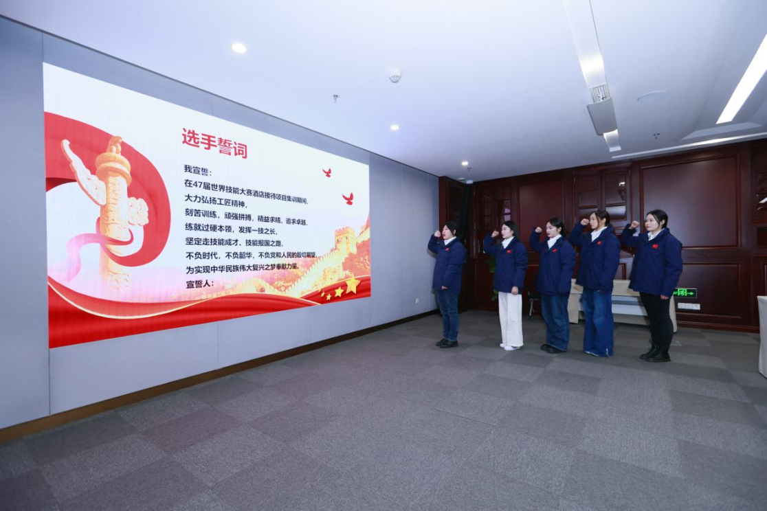 “技能大赛是提升自身技能的重要途径。”上海商学院酒店管理学院学生朱立萱希望通过集训提高技术水平,成为有用的高技能人才。仪式结束后,国家集训队全体选手、酒店接待项目专家教练组组长及组员,各基地代表、选手选派单位代表共赴中共一大会址,回顾革命历史,学习光荣传统,以昂扬的面貌与奋进的姿态出征。