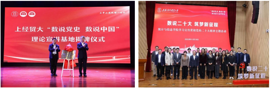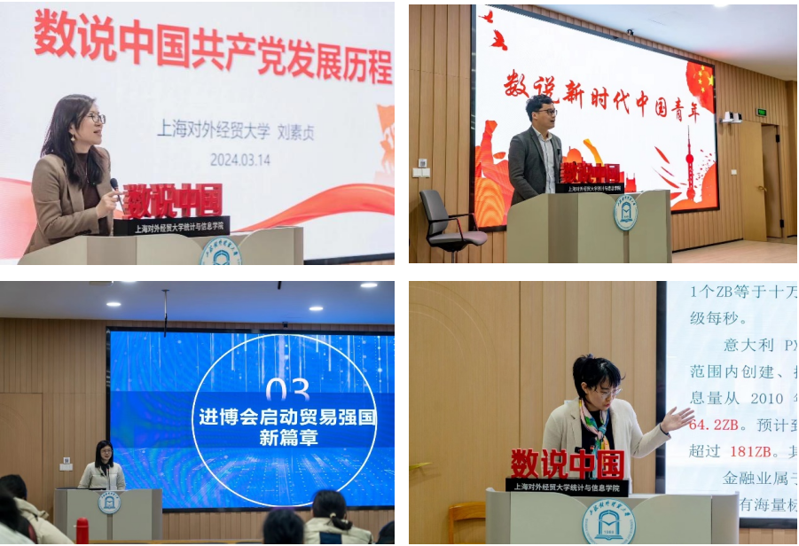 自2022年5月起,上海对外经贸大学统计与信息学院党委推出了“数说党史 数说中国”理论学习项目,结合学科专业特色打造“党史+学科”学习教育模式,开展“数说”系列课程和活动。2022年11月,基于“数说党史 数说中国”项目设计并开展了“数说二十大”系列宣讲课程,成为学校党的二十大精神学习宣讲活动的鲜亮品牌。一年多来,宣讲团师生走出校园,把课程送进大中小学、街道社区、田间地头、企业车间,共计开展理论宣讲活动60余场,制作理论宣讲视频20余部,累计辐射受众万余人次,受光明日报、解放日报、中国青年报、学习强国等20余家主流媒体报道47次,建立5个“数说党史 数说中国”理论宣讲基地和课程联合开发计划,形成广泛的社会影响。2024年3月,学院进一步优化课程体系,向全校学生开设“数说党史 数说中国”选修课程。目前课程已经讲授了4个主题的课程,包括“数说中国共产党发展历程”“数说新时代青年”“数说贸易强国建设”“数说金融科技”。课程内容体系化、专业化、特色化,尤其突出“数字化”,师生运用数据挖掘和统计分析方法,以大量数据、图表、分析对比和可视化的方式多维度直观呈现党的二十大精神,数字赋能让课程更有说服力,让师生更有“共鸣”、能“共情”。接下来,课程还将开展“数说脱贫攻坚”“数说共同富裕”“数说绿色发展”“数说人民生活新图景”等多个主题课程,继续为学生们展示中国的辉煌成就和未来发展潜力。