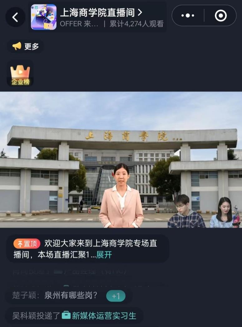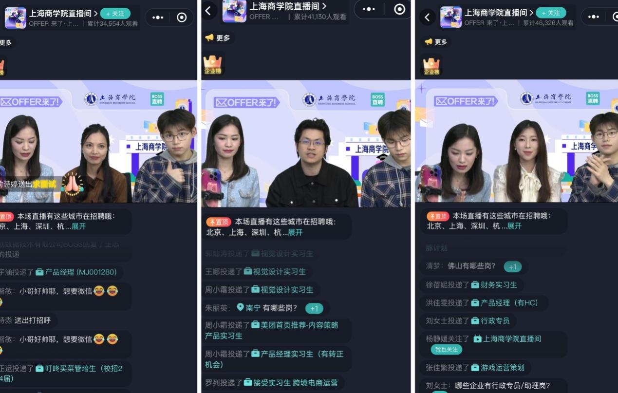 4月9日,上海商学院与BOSS直聘联合举办“‘职’通未来‘就’等你来”直播带岗活动。活动吸引了字节跳动、美团、特斯拉、小米等世界五百强、上市公司以及重要行业关键领域重点企业的参与,共计173家单位,带来招聘岗位230个。累计观看人数55102人,互动次数超过14.2万次,点赞量13.4万次,投递简历5088份。这是上海商学院抢抓春季促就业关键期,进一步推进2024届毕业生就业工作的一大举措。