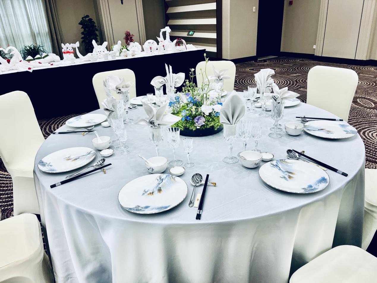 记者看到,唐思怡这次设计的中餐宴会设计摆台别具匠心,整个台面采用银灰色台布作为铺垫,搭配标有雄峰的蓝底餐盘与台布颜色相互映衬。餐具按照中式传统摆放方式,以碗为中心,筷子、勺子、碟子等依次摆放。餐具间保持适当的间距,整体布局整齐而又不失灵动。