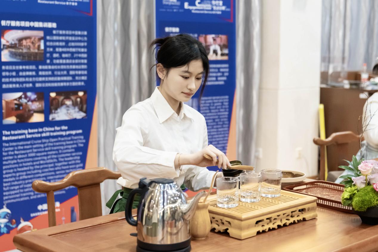 “本次中餐摆台设计,我们将以水墨丹青为灵感,以墨色为基调,以笔触为灵魂,勾勒出千变万化的山水世界……”4月26日下午,在上海大厦三楼的香宫,上海南湖职业技术学院的大二女生唐思怡身穿一袭漂亮的藏蓝色旗袍,站在展览中央的中餐宴会设计摆台旁,落落大方地向观众们介绍着自己的摆台作品。