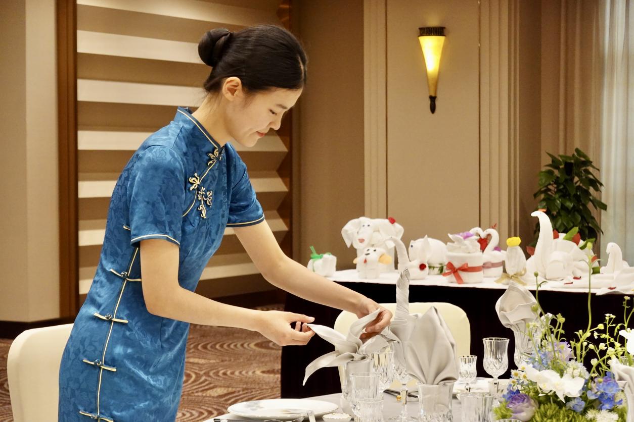 唐思怡在摆台(用餐巾叠玉兰花造型)