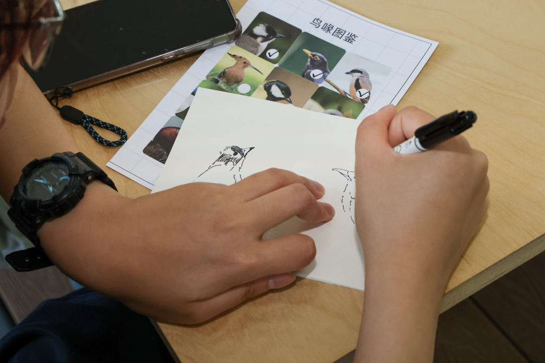 在活动中,王京超为学生们详细讲解了鸟类分类、生态行为与生存智慧,以沉浸式自然游戏,让在场同学理解了鸟的喙与食的关系。鸟喙的形状是鸟类随着时间的推移,逐渐适应环境的一个典型例子。她指出,“除了获取食物,鸟喙还需要承担起攀登、修饰、争斗、筑巢等工作。”通过对鸟喙的讲解,同学们也对自然中生物的智慧有了更生动的认识。