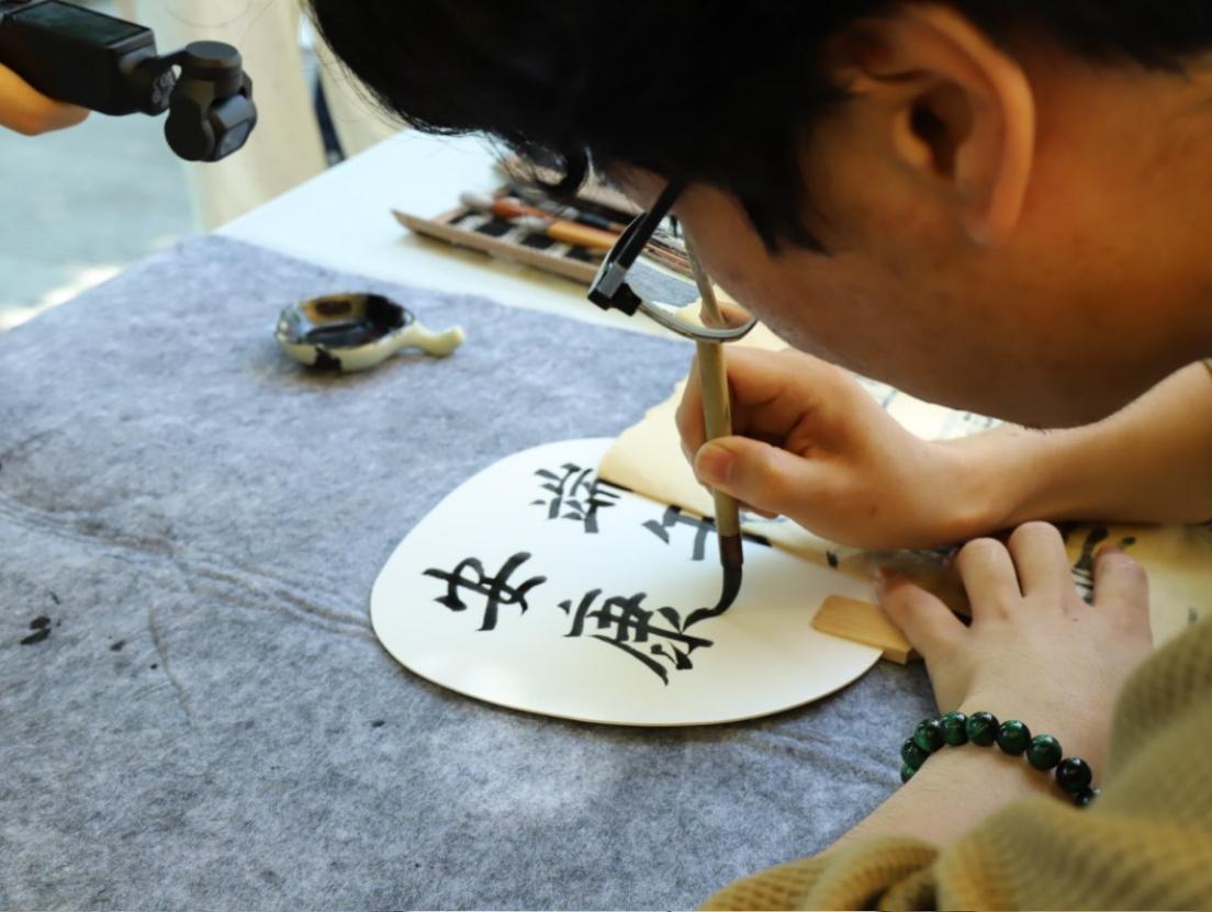 林荫道上,一场中式游园会正在进行。32个各具特色的非遗摊位依次排开,让师生们流连忘返。其中有以“丝网版画”“松江刻漆技艺”等为代表的松江非遗项目,以“织潮玩家”“古法扎染”为代表的学生实践项目,以及以“蹴鞠”“中华射艺”为代表的传统体育项目和各民族特色文化展示。