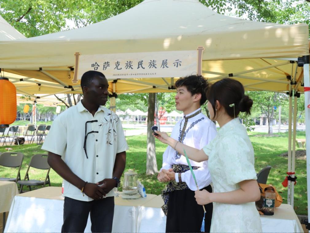 来自刚果(布)的留学生大壮被精彩的文体节目吸引,行云流水的太极球表演、婀娜多姿的江南古典舞以及各具特色的少数民族歌舞表演,让他感受到中国文化的博大精深。令他印象最深的是哈萨克族的民族舞蹈和包粽子活动。他说:“在今天的活动中,我学到了很多中国文化知识,还学会了包粽子,特别有成就感。”
