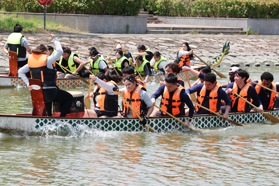 学校第四届中华传统体育文化节暨第八届龙舟比赛也在本次活动中举行。11支参赛队伍在湖面展开角逐,队员们随着铿锵有力的鼓点齐声呐喊,动作整齐划一,展现出昂扬的斗志和团结协作的精神风貌。最终,留学生代表队以优异成绩摘得桂冠。留学生龙舟队鼓手、塔吉克斯坦留学生ZOHIROVA MEHRANGEZ(朱梅)激动地说道:“大家同舟共济,共同努力,龙舟比赛让我们感受到了中国文化。”