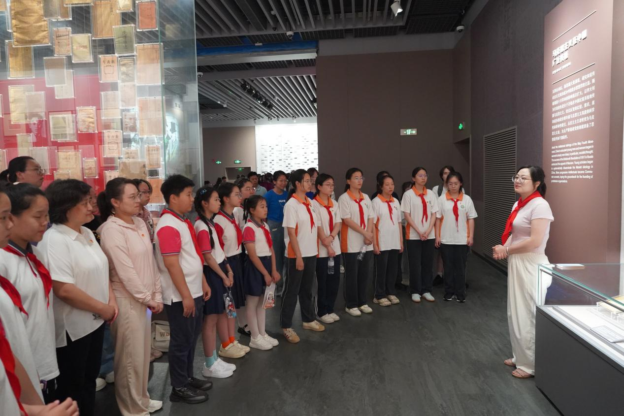 随后,全体师生前往中共一大会址纪念馆参观学习。在纪念馆内,全体师生党员伫立在宣誓大厅的党旗前,重温入党誓词。“马克思经济困窘时,恩格斯毅然放弃自己的研究,长期从事不喜欢的商业工作,资助马克思,助力其完成理论著作,彰显出伟大的革命友谊与高尚品格。”塘外小学大队辅导员周丽萍根据中小学课本中《伟大的友谊》一文,向大家讲述了马克思与恩格斯之间令人动容的友谊故事。