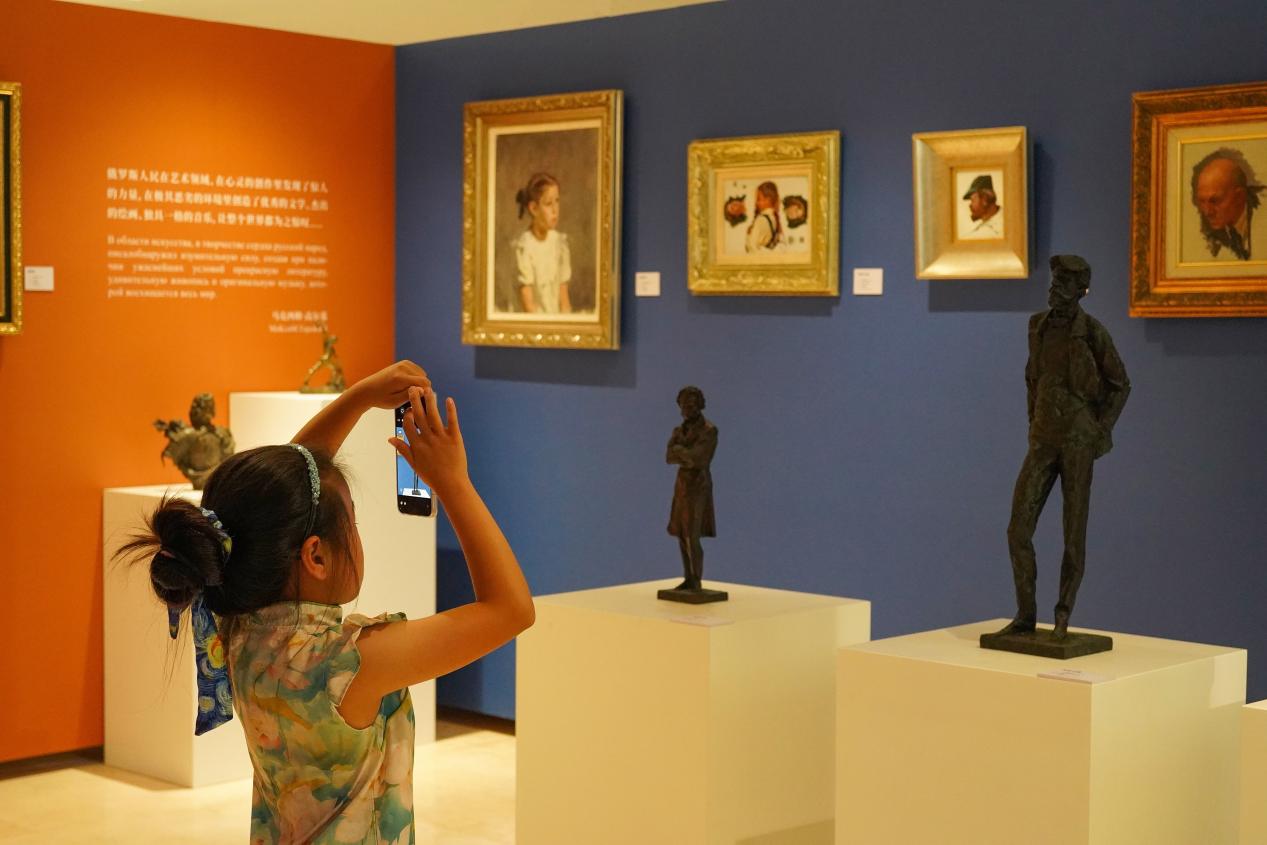 馆内展陈了俄罗斯列宾美术学院多位院长的艺术作品,这些作品不仅是艺术的瑰宝,更是历史的见证。“今日之伟大交响,是昨日交响之内在变奏,是一连串旋律的延续,其变化自无限中生发。此复杂,其称之为‘色彩’。”丁烨引用现代诗人波德莱尔的这段话,以此点明“色彩的交响”主题,并希望通过馆内展陈的瓷器、玻璃、油画、铜雕等艺术作品,让参与者感受到不同器物的色彩与材质带来的独特魅力与温度。