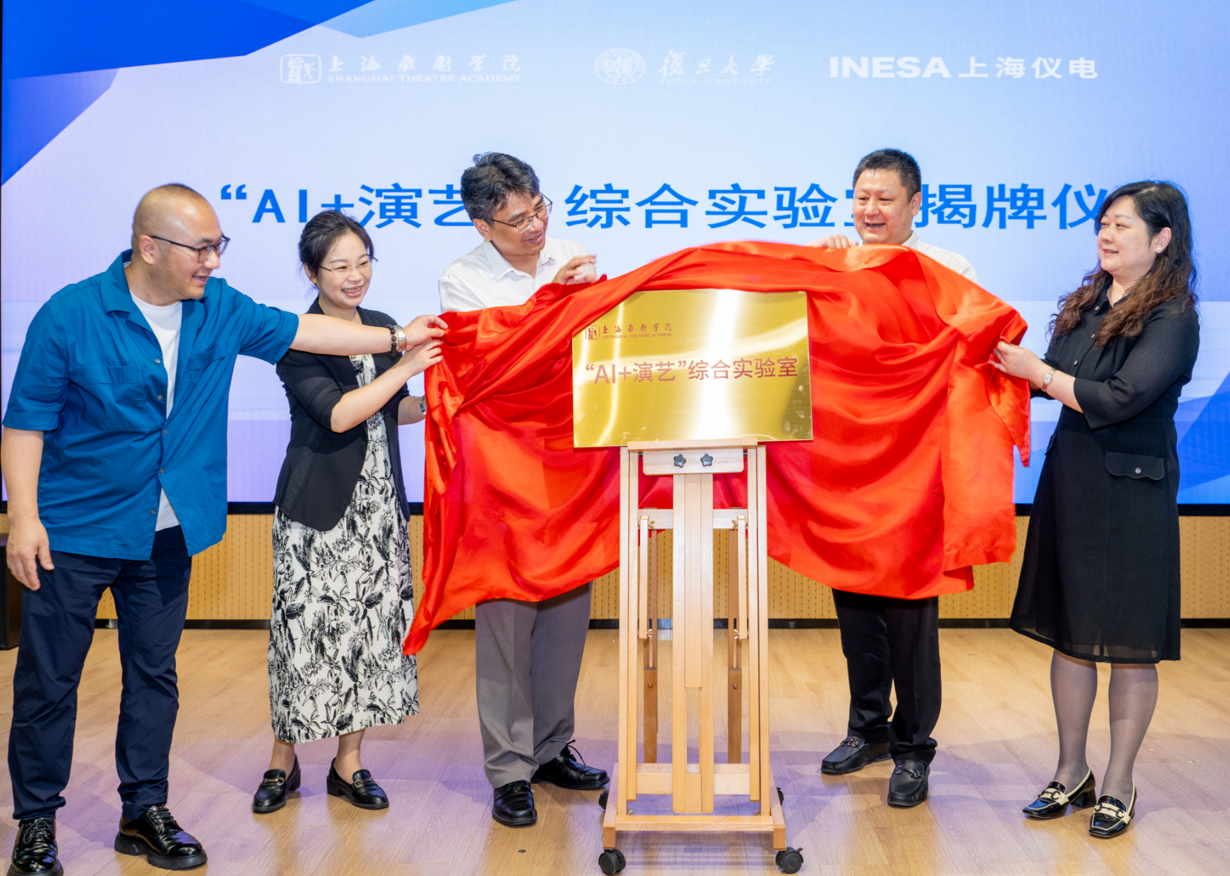 上海市教委科研处处长范仁华,规划处四级调研员蒋侯玲,上海戏剧学院党委常委、统战部长、舞台美术系党总支书记、主任胡佐,复旦大学对外合作处处长周曦,上海仪电集团有限公司云赛智联党委委员、副总经理、工会主席乔艳君共同为三方战略合作的首个重要成果——“AI+演艺综合实验室”的正式启动揭牌。
