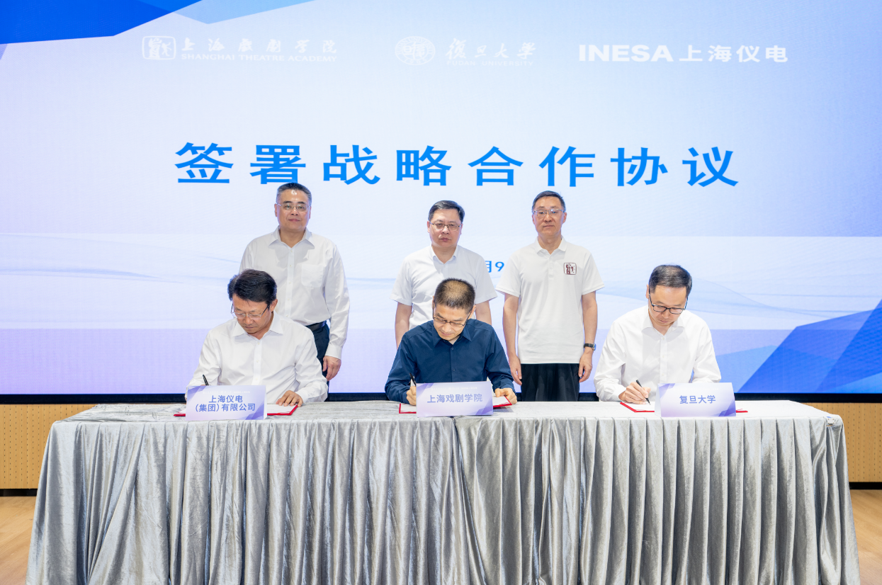 在上海市教委副主任赵震、上海戏剧学院党委书记谢巍、上海仪电集团有限公司党委书记、董事长毛辰的共同见证下,上海戏剧学院副院长聂伟、复旦大学副校长姜育刚与上海仪电集团副总裁黄金刚代表三方签署了《上海戏剧学院、复旦大学、上海仪电(集团)有限公司战略合作协议》,标志着三方战略合作进入全面实施阶段。