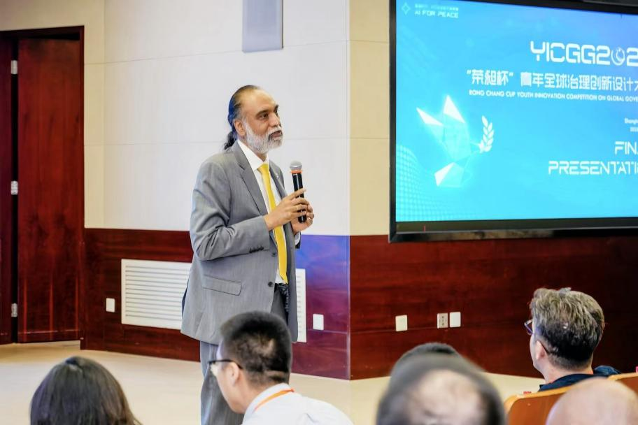 在光华楼志和堂,吉尔一行观摩了“荣昶杯”青年全球治理创新设计大赛(YICGG2025)“AI for Peace”决赛答辩,吉尔对学生提出的人工智能促进和平与安全的创新方案给予高度评价。