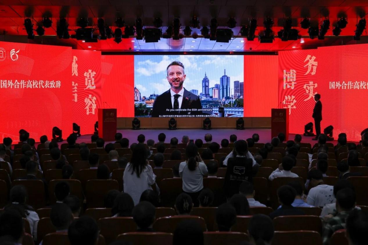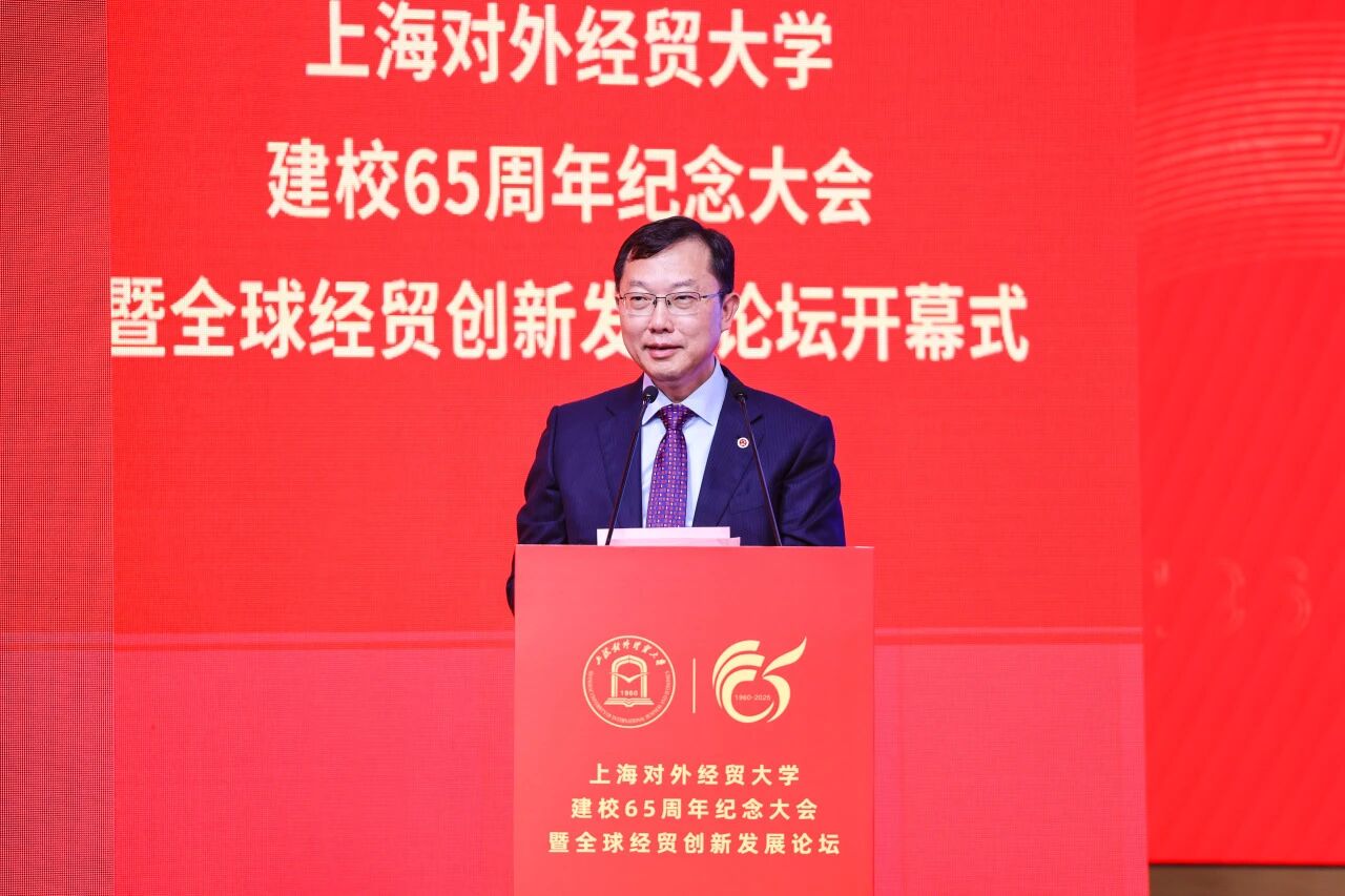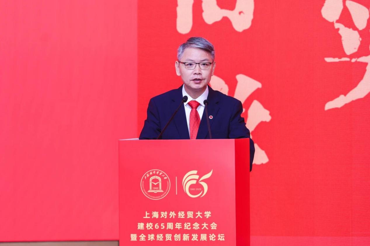 10月18日上午,上海对外经贸大学建校65周年纪念大会暨全球经贸创新发展论坛在学校举行。来自政府部门、兄弟高校、合作单位的领导和嘉宾以及学校老领导、海内外校友及师生代表等齐聚一堂,共同祝贺学校建校65周年。