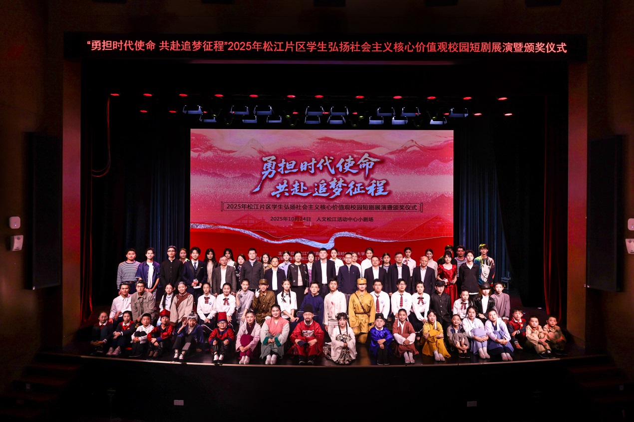 10月24日,由松江区委宣传部和上海对外经贸大学联合举办的“勇担时代使命,共赴追梦征程”2025年松江片区学生弘扬社会主义核心价值观校园短剧展演暨颁奖仪式在人文松江活动中心举行。师生们通过剧中剧的表现形式,弘扬了伟大抗战精神,也在排演校园短剧的过程中接受了一次深刻的社会主义核心价值观教育。