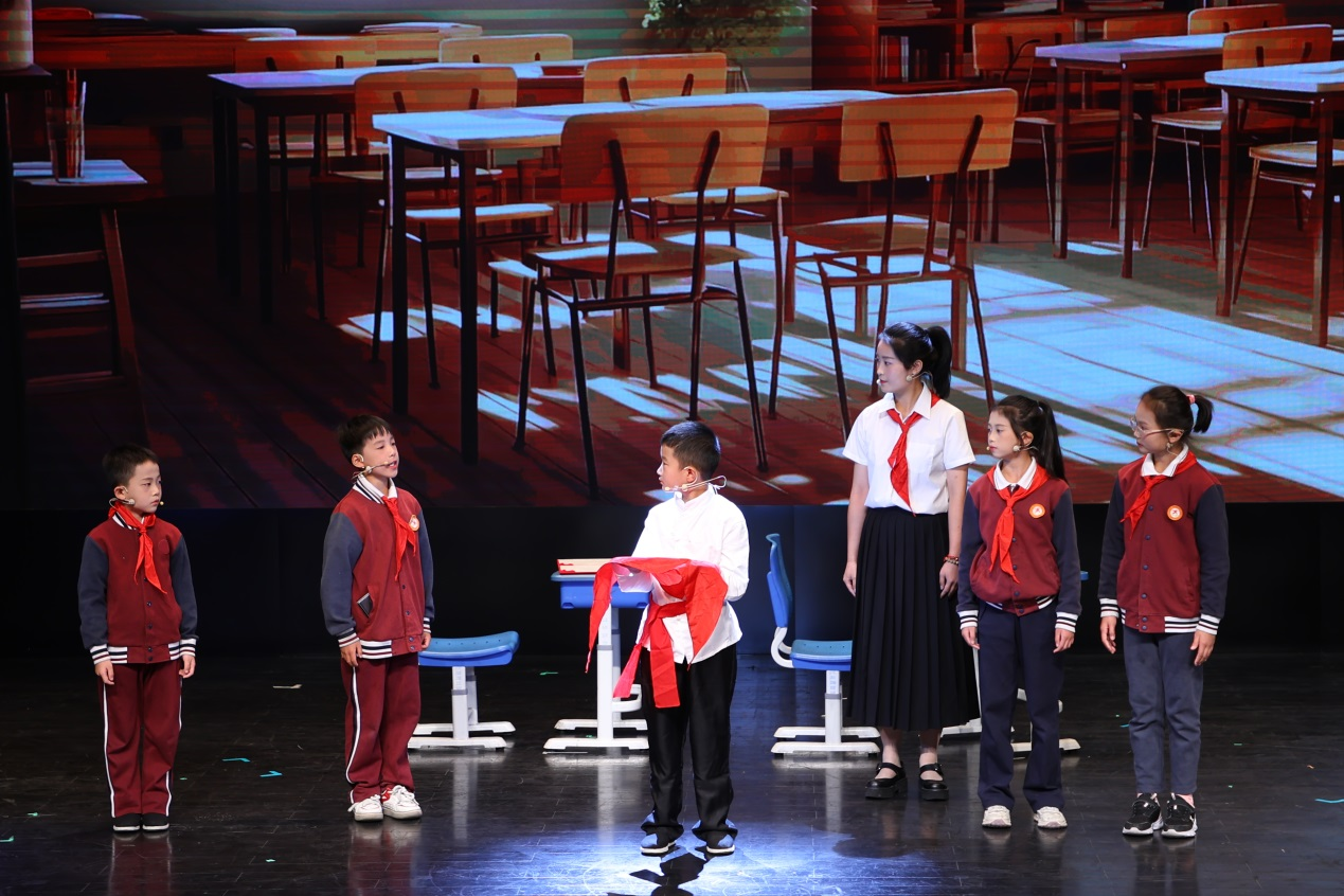 “红领巾……红旗的一角……英雄的血……俺明白了!俺一定会保护好它!等俺们把坏蛋都打跑了,胜利了!俺也要戴上红领巾!像你们一样!”舞台上,抗日小英雄雨来正在和上海市松江区新浜学校学生们进行一场跨越时空的对话。