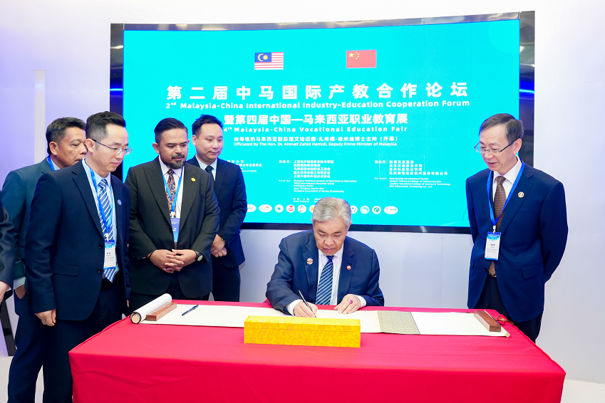 11月7日,第二届中马国际产教合作论坛暨第四届中国—马来西亚职业教育展在上海电子信息职业技术学院举办。马来西亚副总理兼乡村与区域发展部长艾哈迈德・扎希德・哈米迪亲临现场并发表讲话。上海电子信息职业技术学院党委书记傅建勤,党委副书记、院长赵坚及中马两国教育界、产业界200余名领导、嘉宾齐聚一堂,共商产教融合新路径,擘画中马职教合作新蓝图。