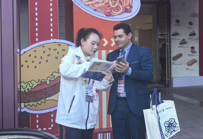临时供餐点的“小叶子”们是进博能量的“补给员”,在人流如织的用餐区维持秩序、优化动线,及时响应各类需求,以温暖服务保障每一位参展观众的用餐体验。