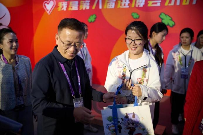 进博会期间,校党委书记赵荣善也来到了国家会展中心,看望慰问服务在一线的“小叶子”们,并为他们带来了一堂以“党史中的体育”为主题的微党课,为志愿者们后续的服务工作注入精神动力,同时叮嘱大家合理规划时间,兼顾志愿服务与学业进度,注意劳逸结合。