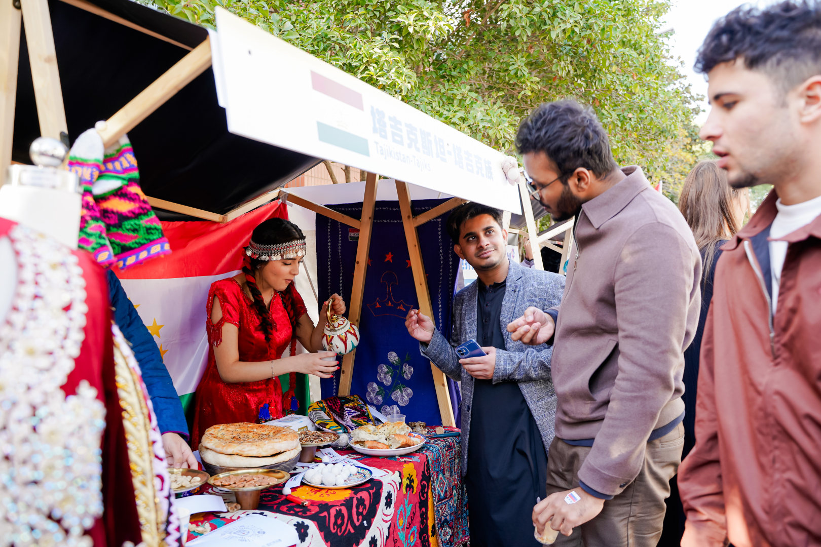 来自12个国家的28个中外民族特色展位一字排开,茶香、美食香与浓郁的文化气息交织弥漫,引得师生驻足流连。白族三道茶“一苦二甜三回味”的味觉层次里,藏着东方人生哲思;苗族银饰的精雕錾刻间,凝结着千年匠心传承;藏族服饰的华美纹样中,能触摸到高原民族的审美底蕴;而越南京族的手工糕点、塔吉克斯坦的特色干果、柬埔寨的雕塑布料,则带来了扑面而来的异域风情。