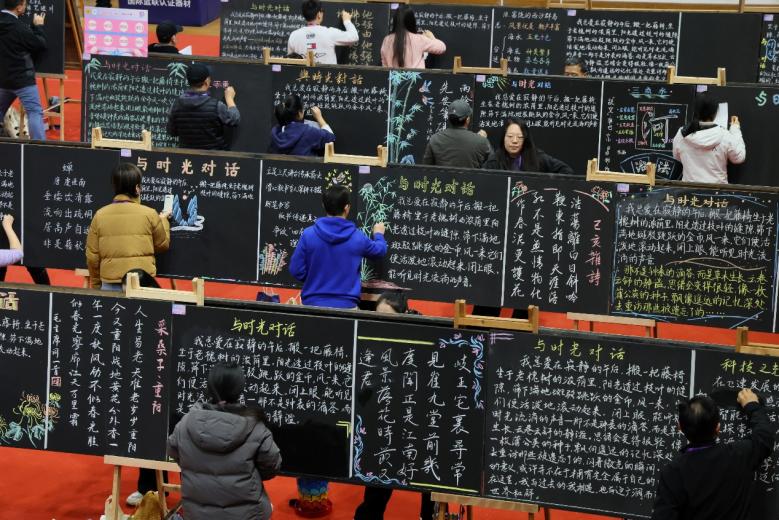 赛事期间,还同时举办了历届优秀作品回顾展,这既是对十年赛事的温情回望,也为现场增添了浓厚的文化氛围,吸引了众多参赛教师驻足观赏、细细品味、合影留念。记者了解到,作为上海教育系统的标志性品牌活动,“三笔字”大赛已连续成功举办十届,始终以提升教师专业素养、弘扬中华优秀传统文化为宗旨,为广大教师搭建起展示、交流与成长的平台。赛事由早期的“三笔一画”逐步聚焦为“三笔字”竞赛,更加贴合新时代劳动与技能竞赛的要求。自2023年起,大赛进一步明确青年教师参赛比例,强化教学基本功的代际传承,引导青年教师以身立教、笔墨育人。