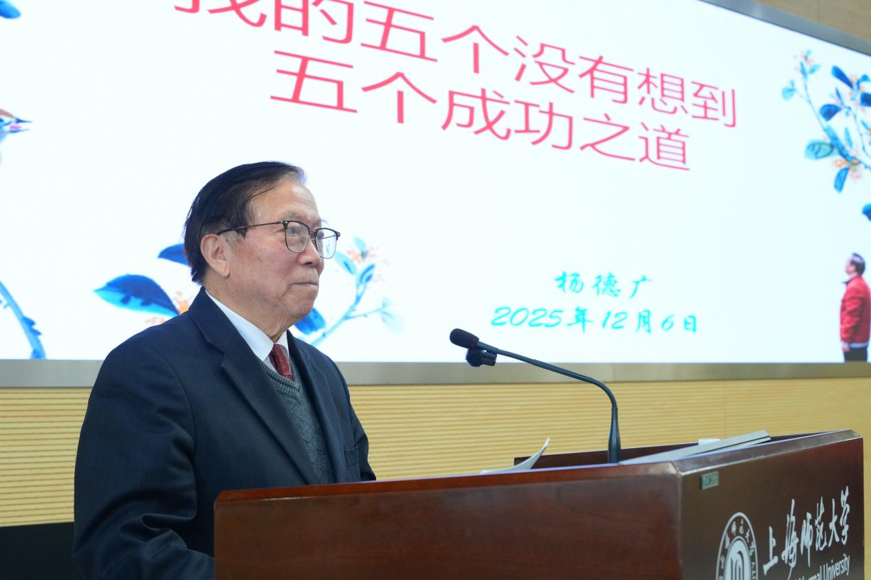 杨德广教授回顾了自己从贫困农村少年到大学校长、慈善楷模的成长历程,总结出了五个成功之道:一要有坚定的理想信念、为国兴旺砺志图强;二要锲而不舍、刻苦学习,用教育改变命运;三要坚持锻炼身体,保持强壮体魄;四是珍惜时间,紧紧把握好世上最宝贵的财富;五要自知自律,坚持勤政廉洁。他鼓励后辈要坚持教育理想、勇于奉献。