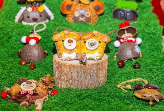 杭州市定山小学虞静婕老师和杭州市文苑小学吴蕴涵老师的废旧果壳创意工作坊,让原本被随手丢弃的废旧果壳焕发出别样新生机。老师和孩子们纷纷加入这场绿色创意实践,跟着两位老师的示范,一步步解锁果壳手作的趣味流程。在制作果壳风铃前需要,提前清洗果壳,并且打孔。先将绳子穿过果壳,用单结绳固定果壳位置,在果壳中间还可以点缀上缤纷串珠,创意在指尖悄然绽放:有人搭配不同形状、色泽的果壳,串成错落有致的清脆风铃;有人在绳结处缠上亮片丝线,让小巧包挂更添灵动细节;还有老师大胆创新,将果壳与干花、彩珠混搭,做出了独具自然野趣的装饰挂件。课间,定山小学的学生们也兴冲冲地挤进工作坊,“我要把亲手做的风铃送给奶奶!”孩子们捧着自己的作品,眉眼间满是藏不住的自豪。这些别致的风铃与包挂不仅悦耳耐看,更让物尽其用的绿色零废理念 “听” 得见、摸得着。