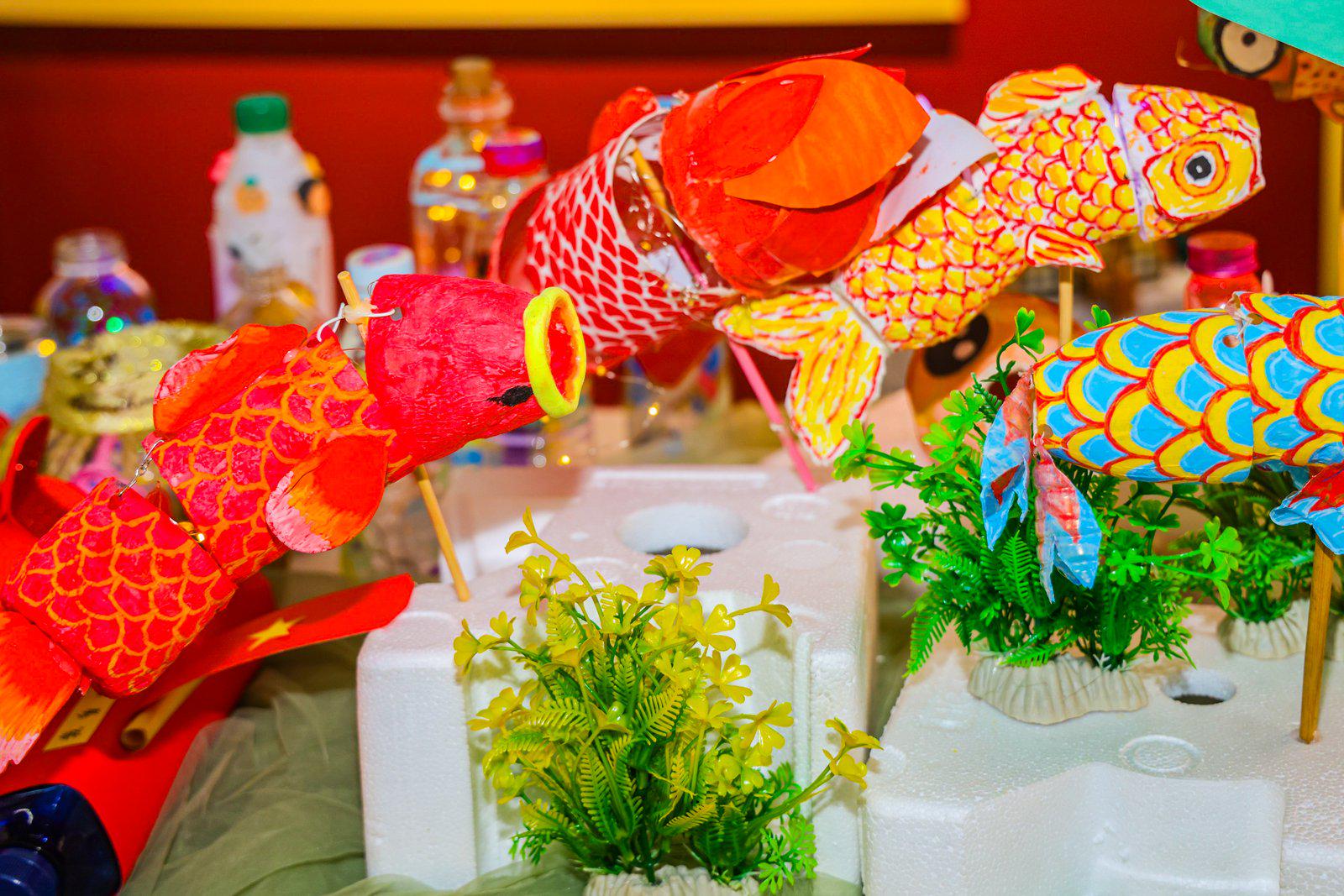 杭州市和家园小学的俞佳老师和罗园园老师,带领学生们收集起日常生活中废弃的透明塑料瓶。他们将瓶身剪裁,通过拼接、勾勒、彩绘等手法,将不起眼的废旧塑料转化为灵动闪烁的西溪鱼灯。同学们还巧妙利用细碎塑料片,制成鱼鳍,让每一条鱼灯在灯光下折射出斑斓光彩。大家自由设计鱼形,在塑料的厚薄、弧度与组合中反复摸索,逐渐完成独具个人风格的“鱼灯”作品。有学生感慨,原本觉得废旧塑料瓶只是垃圾,亲手制作后才发觉其中竟可孕育传统之美。这种从废弃品到非遗文创的转化,让学生在体验手工艺魅力的同时,更生动地领悟到资源再生与文化传承的双重价值。