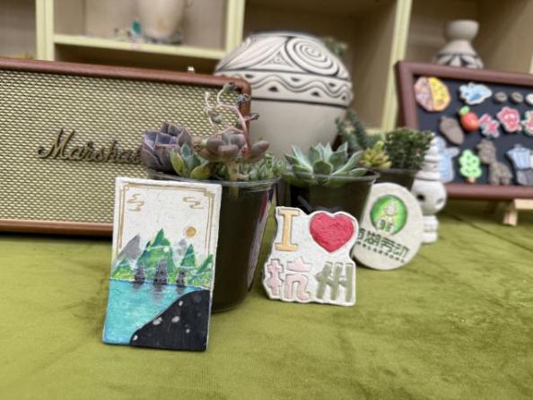 杭州市大禹路小学张青霞老师与杭州市竞舟第二小学许一芳老师和学生们一起将不起眼的咖啡渣,巧变为承载西湖元素的冰箱贴与扩香石。刚开始,大家面对咖啡渣配比、塑形脱模这些精细活,显得手足无措,设计思路也十分单一。但随着对西湖断桥、三潭印月等景致传说的深入了解,灵感渐渐涌来。为了做出精致的作品,孩子们自发分工:有的专注调配咖啡渣与黏合剂的比例,有的精心雕琢石塔、荷花的模具造型,有的用颜料点缀出西湖的湖光山色。一次次搅拌、塑形、装饰,孩子们的手艺越发娴熟,作品的湖韵特色也愈发鲜明。最终出炉的文创,每一件都凝着淡淡咖香与西湖韵味。“不仅学会了废物利用的技巧,还在动手中读懂了西湖之美,分工合作的快乐更是难忘!”