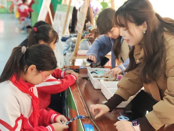 杭州市行知小学的王艺涵老师和徐嘉怡老师的《旧衣物巧利用》课堂将家里闲置的的旧布料焕发了新活力。除了学生,西湖劳动教育课改研讨会上,还组织了老师们一起动手动脑参与系列绿色劳动零废合伙人工作坊,老师们跟着示范学起了三股辫编法。掌握基础技法后,大家的创意彻底放飞:有人挑选深浅相近的布料,编出渐变效果的斜挎链;有人在三股辫中穿插彩色细绳,增添灵动细节;还有人尝试四股辫编法,将编好的布条做成灵巧的小蜜蜂链,格外别致。课间,学校的学生们也加入了工作坊,“我要把自己做的手机链送给妈妈!”大家捧着亲手制作的作品,脸上满是自豪。手机链不仅实用,更藏着孩子们对可持续生活的理解。