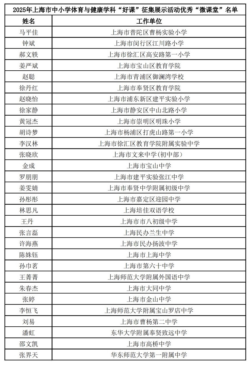 在上海市教育学会、上海市教师教育学院(上海市教育委员会教学研究室)、上海市科技艺术教育中心的指导下,上海市教育学会中小学体育与健康教学专业委员会自2025年7月启动的上海市中小学体育与健康学科“好课”征集展示活动近日迎来收官。