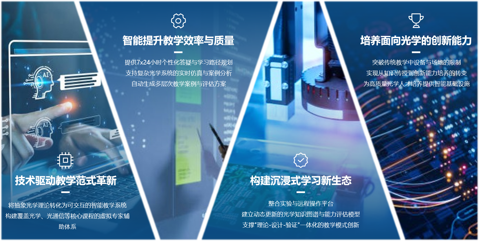 作为完全自研的国产模型,光学大模型具备鲜明的“四大特点”:轻部署、高认知、强应用、全可控。作为新一代智能教学工具,模型能够将抽象的光学理论与复杂公式转化为直观的可视化演示与互动问答,并可自动生成丰富的教学案例与虚拟实验,从而变革传统教学模式,显著提升教学效率与学习体验。而在科研方面,它可作为全天候的智能研究助手,帮助科研人员快速梳理文献、启发创新构想、完成复杂模拟计算,并辅助设计实验方案,从而加速从理论到验证的科研进程。