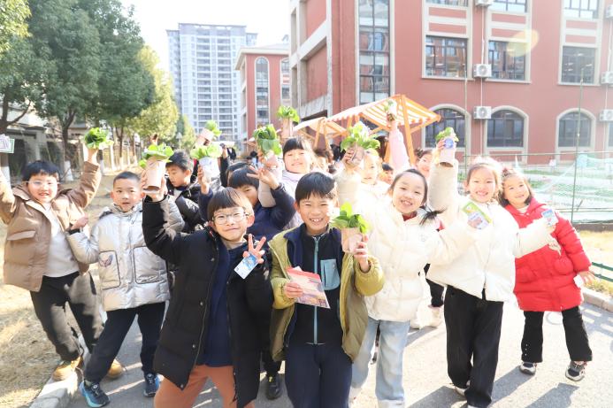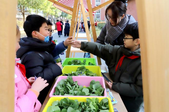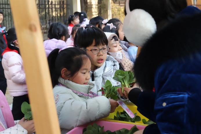 全校学生分批涌进菜园,摊位上整齐地码着水灵灵的青菜。最特别的是“货币”,这些是孩子们平日积攒的海鲸币和积分。“上周,我帮助生病的同学打扫卫生,老师奖励了我好多积分!”孩子们攥着“劳动所得”认真挑选,冬日的校园呈现出一派暖融融的美好氛围。