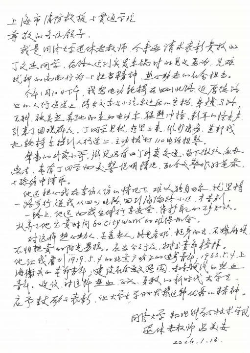 一封来自同济大学退休教师吕美安的感谢信,近日寄至上海电子信息职业技术学院消防救援与贯通学院,字里行间满是温情与敬意,不仅诉说着一段发生在上海冬日街头的暖心故事,更让丁文杰同学的善举被更多人知晓。2026年1月10日下午,在虹口区四川北路厚德路人行道上,同济大学退休教师吕美安乘坐的电动轮椅被一辆疾驰而过的外卖电动车撞倒,突如其来的意外打破了街头的平静,撞击声迅速吸引了过往路人围观,途经此处的丁文杰,第一时间留意到现场情况。