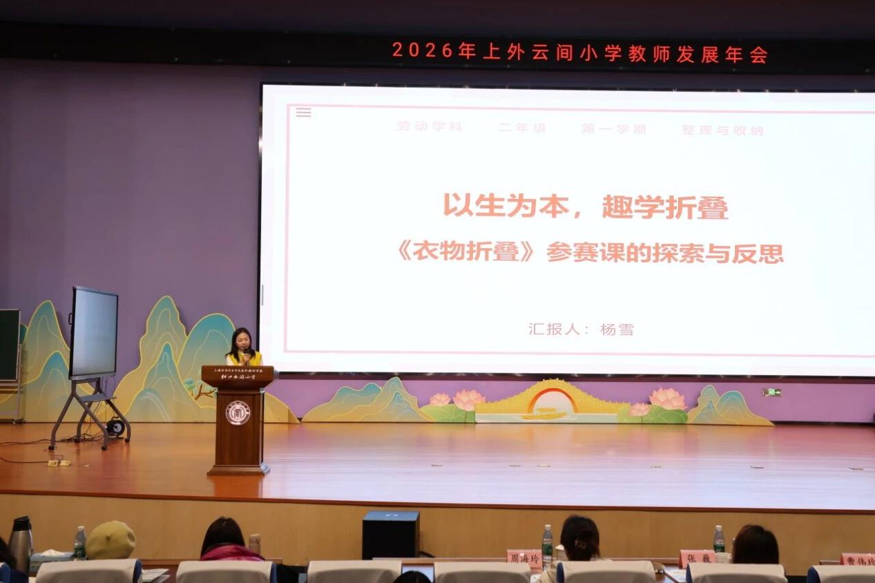 教材是给定的,但课程可以有自己的性格。劳动教育方面,杨雪老师分享了区级获奖课程《以生为本,趣学折叠》的设计经验。她以二年级劳动课《衣物折叠》为例,紧扣"趣味化、分层化、实操化"理念,通过"勤宝"卡通形象、折叠闯关赛等创新设计,激发学生学习兴趣。