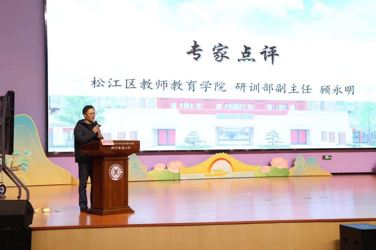 松江区教育学院研训部副主任教师教育办公室负责人顾永明对年会进行了精彩点评。他肯定了学校在教师专业发展上的系统设计与扎实推进,认为四个板块逻辑清晰地勾勒了教师成长的完整闭环,各项展示既有教育创新的前沿探索,又始终扎根于课堂实际与学生发展,充分体现了云间教育的“专业深度”与“育人温度”。