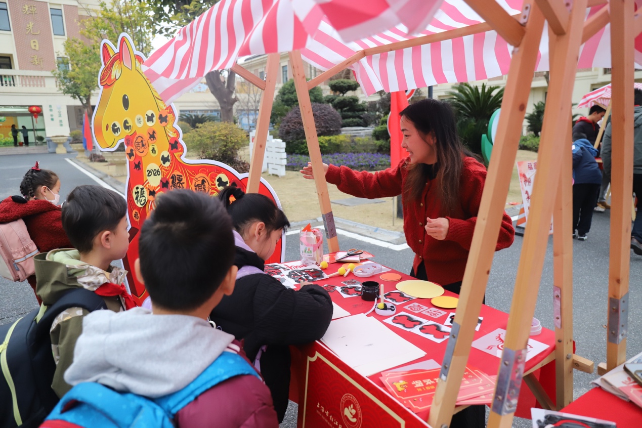 与此同时,“骏影同春”区域同样人气高涨。学生们争相与马年特别版吉祥物“葵葵”“园园”合影,这对由八年级学生俞璐茜设计、全员票选出的“校园明星”,是真正源自学生的童心结晶。镜头里是少年的意气风发,镜头外是对生命奔腾向上的期许。