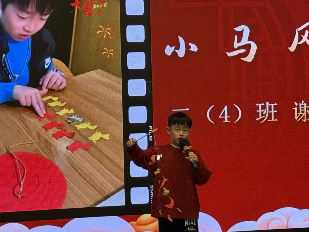 “这是我制作的马年手工拓画,我爱上了这古老又好玩的传统工艺。”“今天,我带来的是一道具有春节气氛的小点心——马年造型饭团,将胡萝卜切成长条做成马的鬓毛,用海苔做了马的眼睛、马鞍和马蹄。”开学第一天,黄浦区卢湾二中心小学的孩子们上台为自己的马年小制作“代言”。