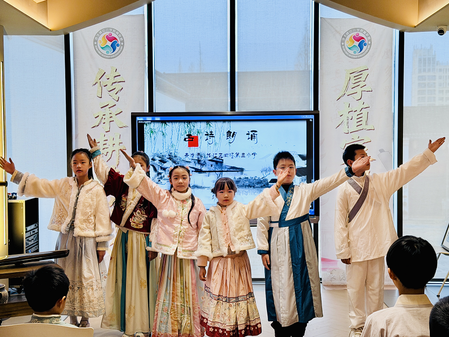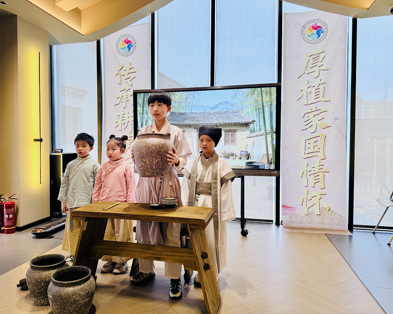 泗泾小学的孩子们带来情景剧“瓦罐里的坚持”,再现陶宗仪在乡间“每日记录三件事”的坚守。当“日积月累,微光成炬;每日三记,贵在坚持”的童声响彻草堂,在场观众无不动容。互动环节中,孩子们分享身边的“坚持故事”,并立下“每天阅读10分钟”的微行动承诺。