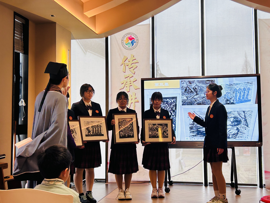 松江四中的“古今对话”将课堂推向高潮。学生们通过诵读《南村辍耕录》选段、展示古镇风景版画、运用AI技术还原元代泗泾风貌等方式,向先贤汇报今日中国对传统文化的继承与发展。从版画镌刻到数字再生,同学们用行动诠释着“创造性转化、创新性发展”的深刻内涵。