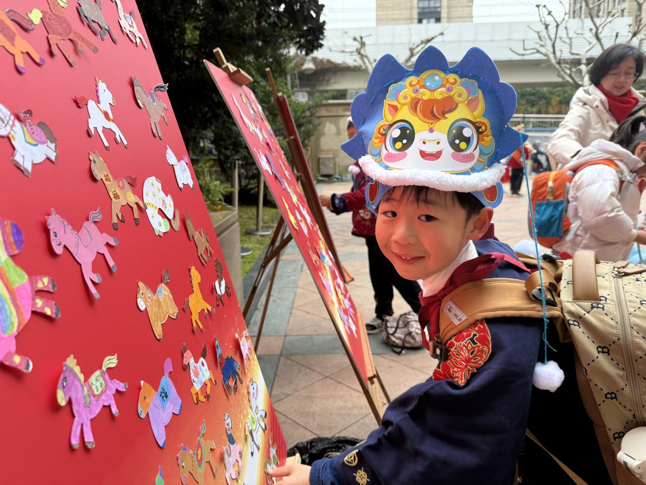 华东师大附小总部校门口,身着春节传统服饰的学生们鱼贯而入,展现出浓浓的文化自信。分部校区则别出心裁,学生们头戴自制的小马头饰,并将亲手绘制的“小马”画作张贴在校门上,汇成一幅“万马奔腾”的生动图景,寓意全体学子携手同行、共赴新程。每位进校的学生还收到了一份“马年迎新盲盒”,寄托着学校“马到成功”的美好祝愿,激励孩子们在新学期探索未知、一马当先。活动以“马”为线,巧妙串联起传统年俗与校园文化,让学生在仪式感中感受文化魅力,以昂扬姿态开启新学期。