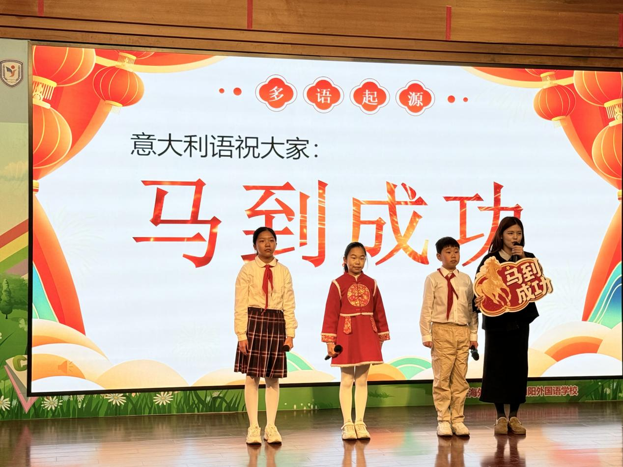 上外尚阳学校的开学典礼以“马年勤奋进,策马向新知”为主题,打破传统模式,将马年元素与多学科知识深度融合,打造了一堂趣味盎然的“开学第一课”。各学科教师轮番登台,深挖“马”背后的学理奥秘:数学老师拆解“走马灯数”,体育老师解析“马步”与象棋,物理老师讲解“马力”单位的由来,历史组结合东汉铜奔马讲述马的文化内涵,语文和外语组则通过师生合作,朗诵马主题诗词、用多语种送上马年祝福,兼具文化底蕴与国际视野。校长以骏马奋进之姿寄语全体师生勤学善思、笃行实干。全校师生在这场融知识性、教育性于一体的活动中,践行“尚德睿智、求美向阳”校训,以昂扬姿态开启探索之旅。