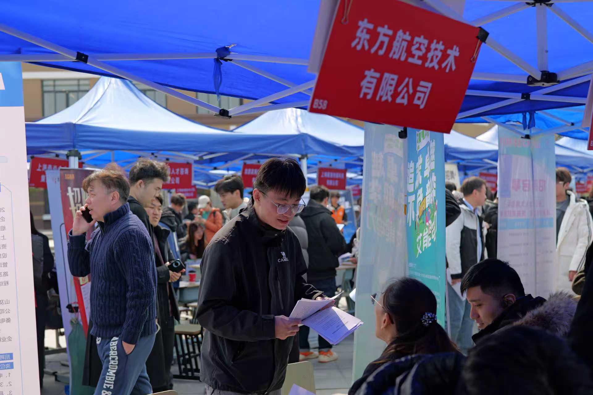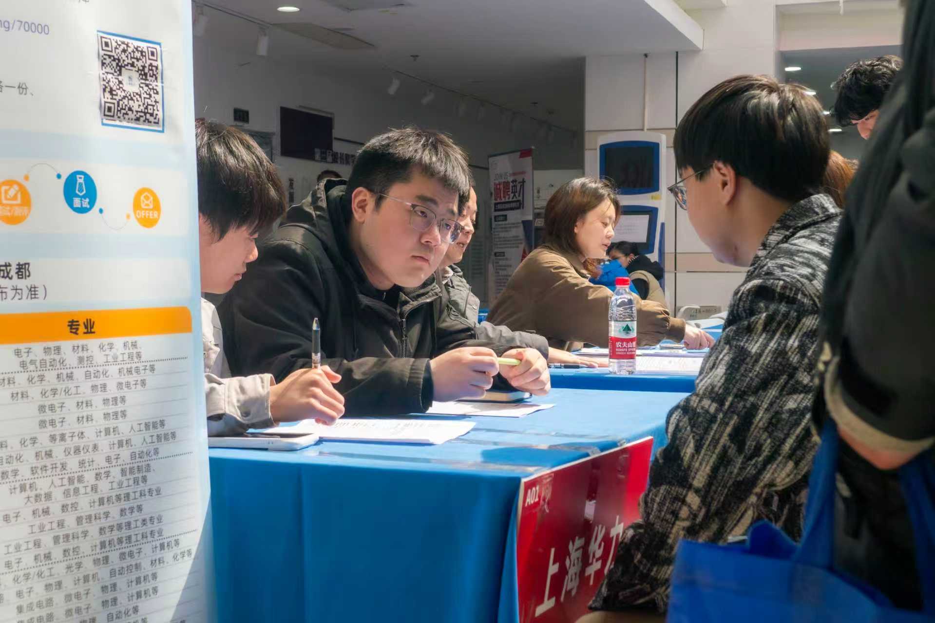 招聘会现场气氛热烈,企业展位前咨询队伍络绎不绝。本次招聘会参会企业覆盖集成电路、民用航空、能源装备、智能制造等领域,既有上海电气、上海华力、上海航天控制工程研究所等国有重点企事业单位,也有能量奇点、睿昇半导体等专精特新“小巨人”企业,其中来自临港新片区的企业占比达35%。上海航空发动机复合材料有限责任公司、上海临科智华数字科技有限公司、中国科学院微小卫星创新研究院、上海邦芯半导体科技有限公司等一批扎根临港的企业备受毕业生青睐。