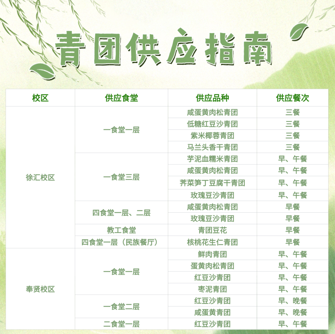想要集齐所有春日风味?华理还准备了一份超详细的华理青团供应指南,供应食堂、品种、餐次一目了然,助力规划完美“寻春”路线。手作青团,每日限量,各食堂将持续供应至4月5日前后。