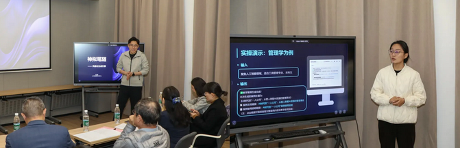 人工智能数据工程中心的技术负责人于正旺带来“神拟笔随(风格化稿件引擎)”主题分享,系统讲解了技术平台的核心架构与校园应用场景,直观展现了AI在内容创作领域的技术实力。人工智能数据工程中心的全栈工程师李梦雪带来“CaseAI(课堂教学案例助手)”主题分享,针对当前教学中时新案例缺位的痛点,面向人文社会科学教学领域智能生成教学案例以提升教学质量。
