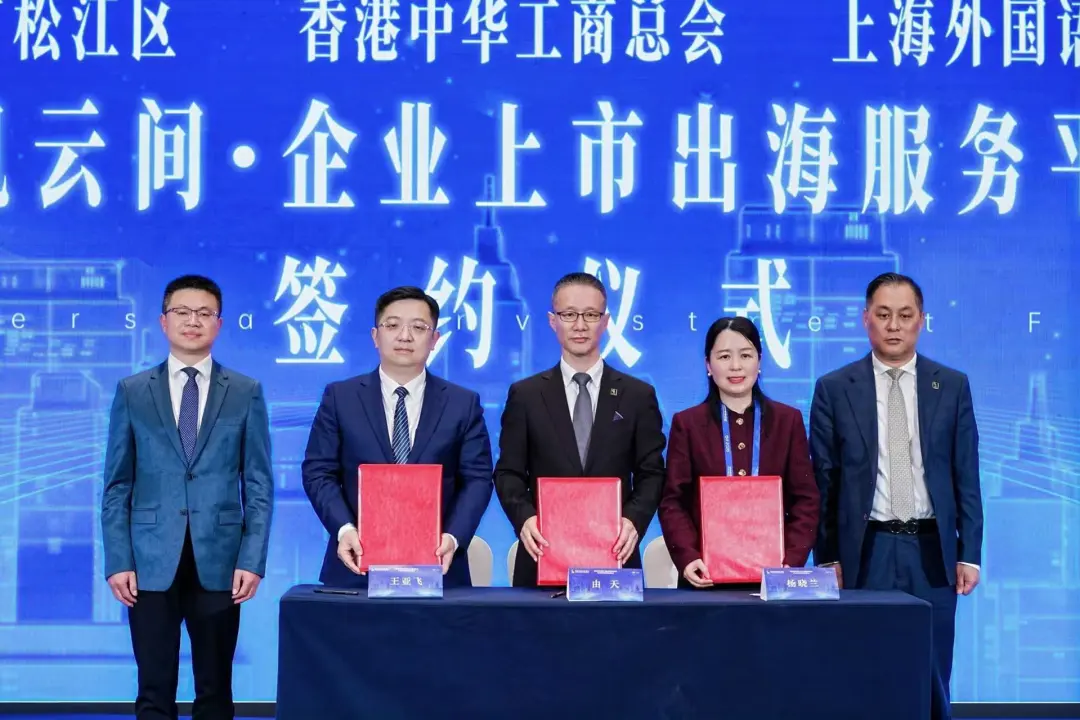 在“布局香港新机遇对接会”上,上海外国语大学国际工商管理学院与上海市松江区商务发展促进中心、香港中华工商总会上海代表处三方共同签署“扬帆云间·企业上市出海服务平台”合作备忘录。上外副校长衣永刚、香港中华工商总会执行主席兼行政总裁陈峰见证仪式。上外国际工商管理学院院长杨晓兰完成签署。
