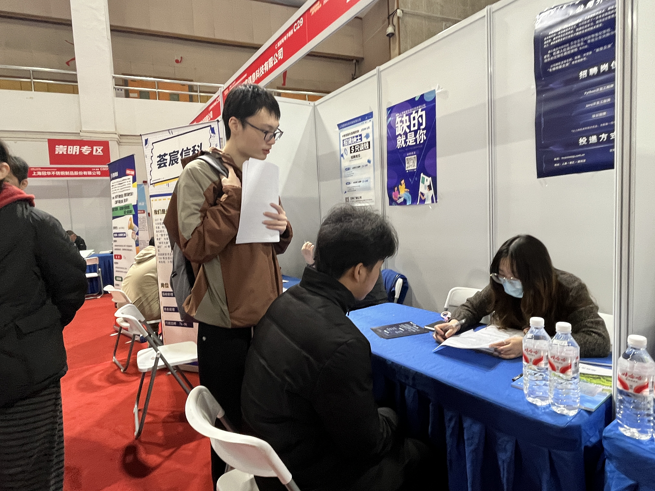 应届毕业生在招聘会现场咨询和面试